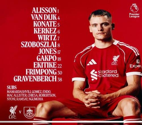 替补:25-马马尔达什维利、2-乔-戈麦斯、3-远藤航、10-麦卡利斯特、14-费代里科-基耶萨、26-罗伯逊、42-尼奥尼、73-恩古莫哈、47-卡尔文-拉姆齐